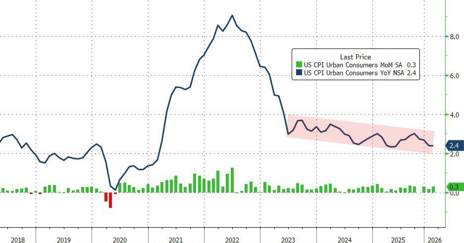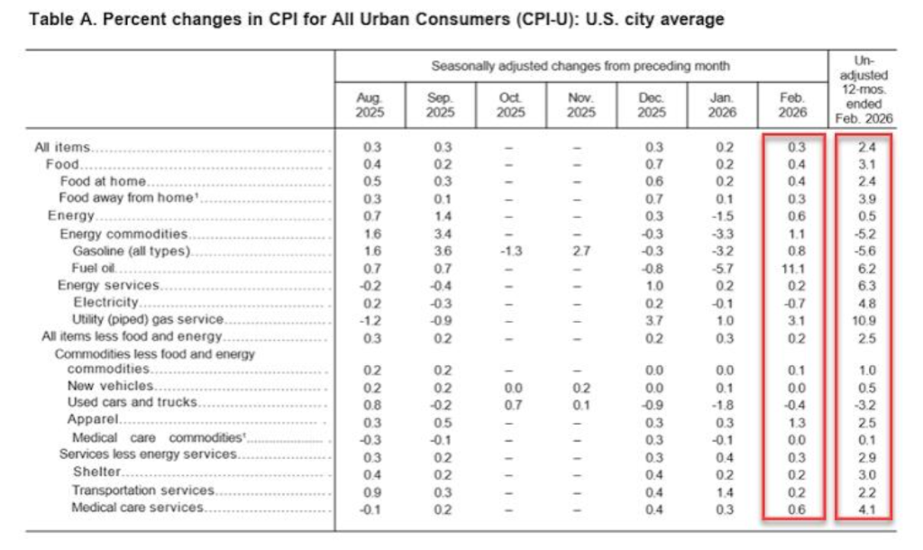 Data released by the U.S. Bureau of Labor Statistics on Wednesday showed that February's CPI rose 2.4% year-on-year, matching both expectations and the previous reading; month-on-month growth was 0.3%, in line with expectations and slightly above the prior 0.2%.